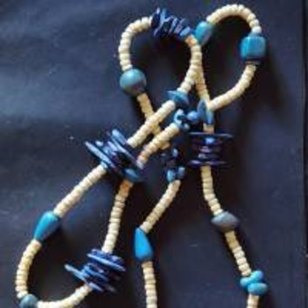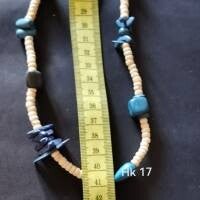 Halskette in Holz-Optik, Naturfarben mit blauen Scheiben- Elementen, Vintage-Stil, Hippi, (HK17)