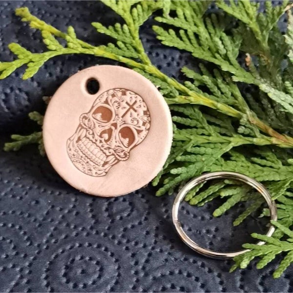 Schlüsselanhänger, Leder, La Catrina Totenkopf, rund 4 cm Durchmesser (SA17)