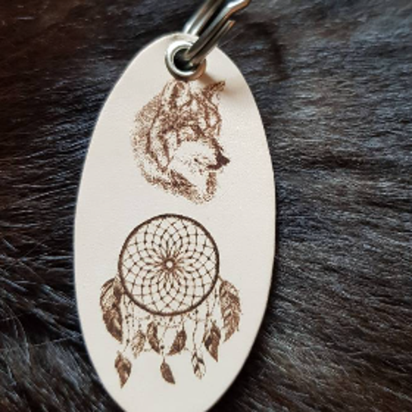 Schlüsselanhänger Wolfskopf mit Traumfänger, Vollleder (SA1)