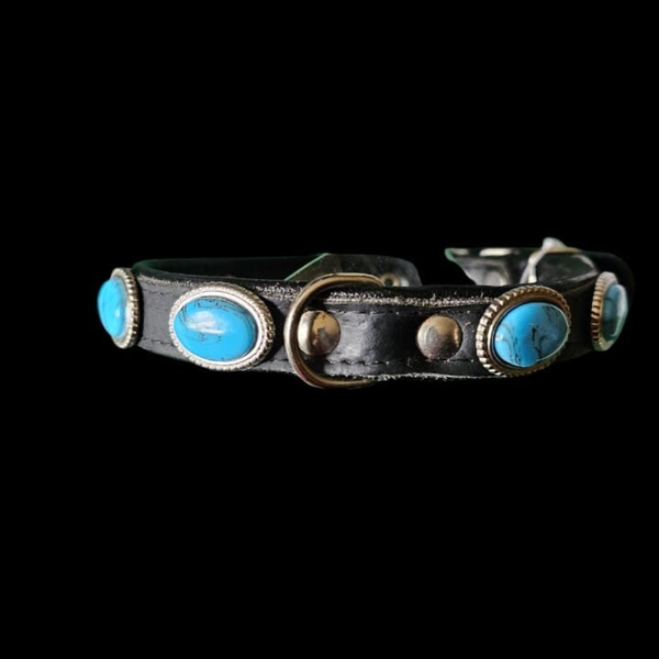 Hundehalsband, schwarz, türkisfarbenen Cabochons (HH 03)