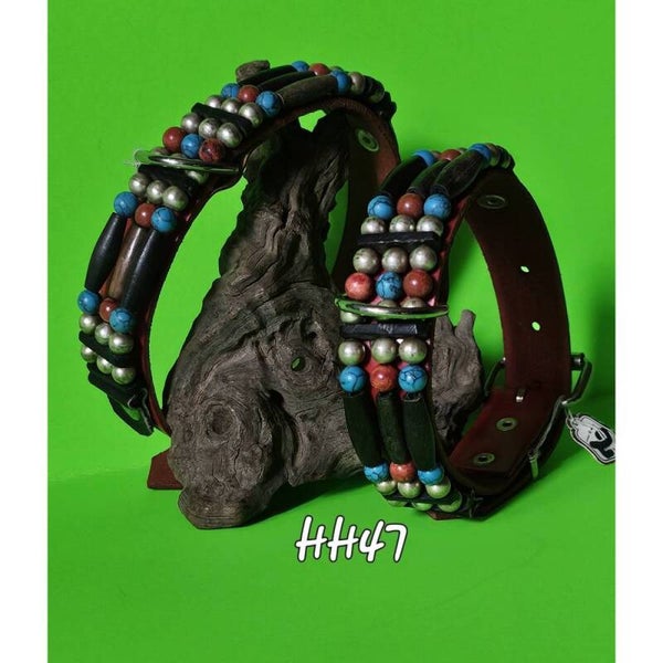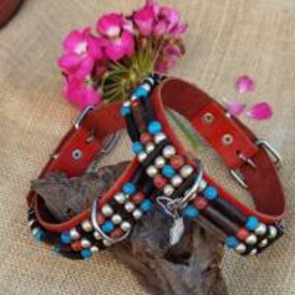 Viele Hundehalsbändern haben einen Besatz, der fest mit dem Halsband verbunden ist und ebenfalls aus Naturmaterialien besteht wie Knochen, Horn und Edelsteinperlen.