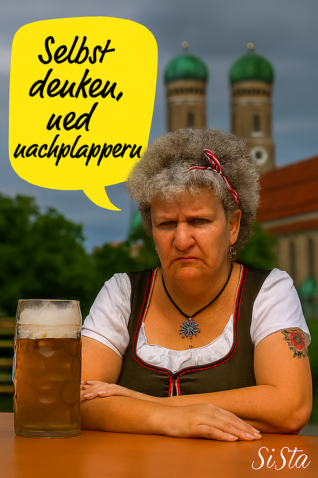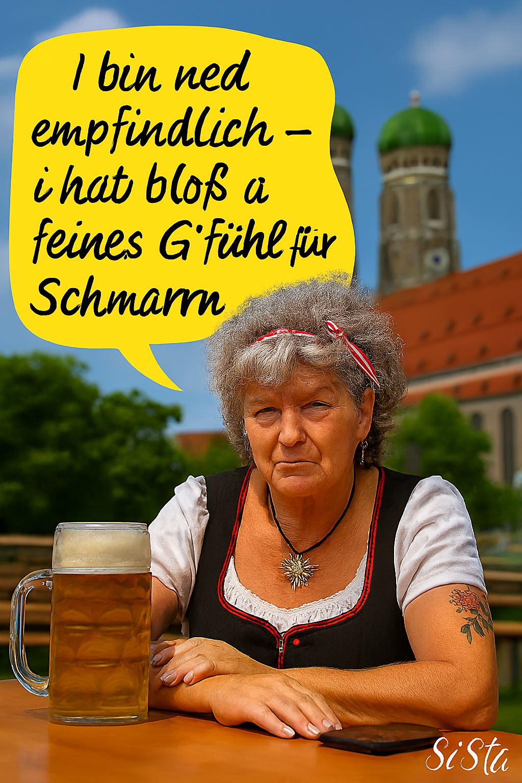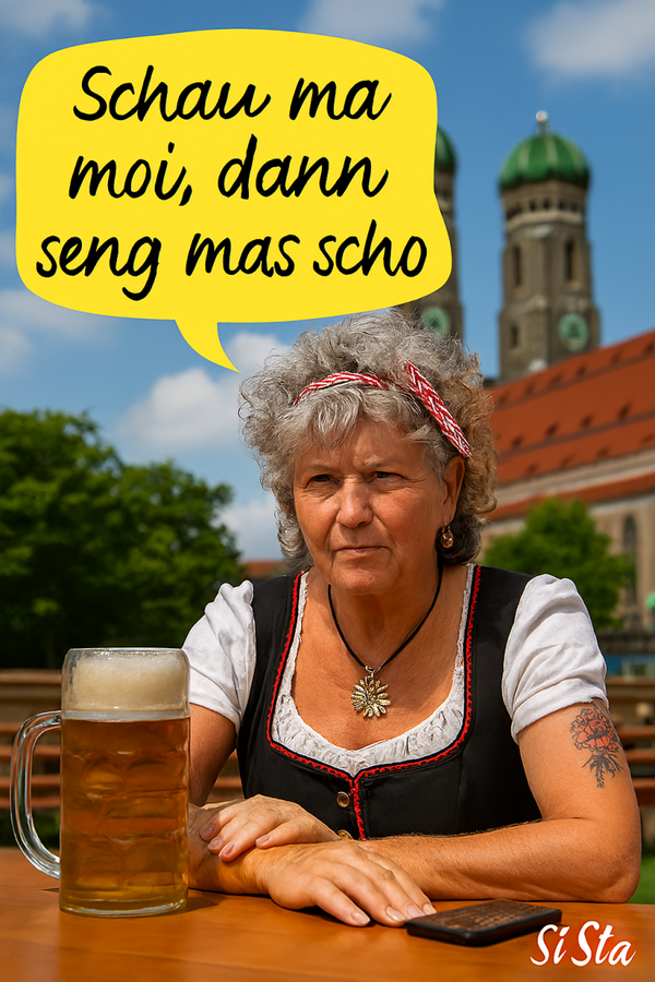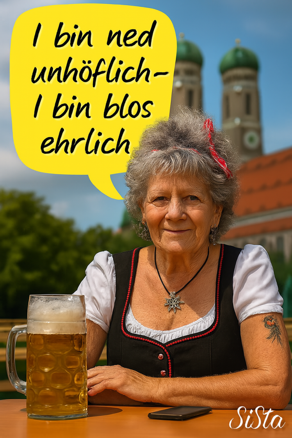 Die Bayerische Grantlerin sagt, was Sache ist – mit einem Maß Bier vor sich, einem Blick, der keine Ausreden duldet, und Sprüchen, die sitzen wie ein Dirndl am Sonntag.