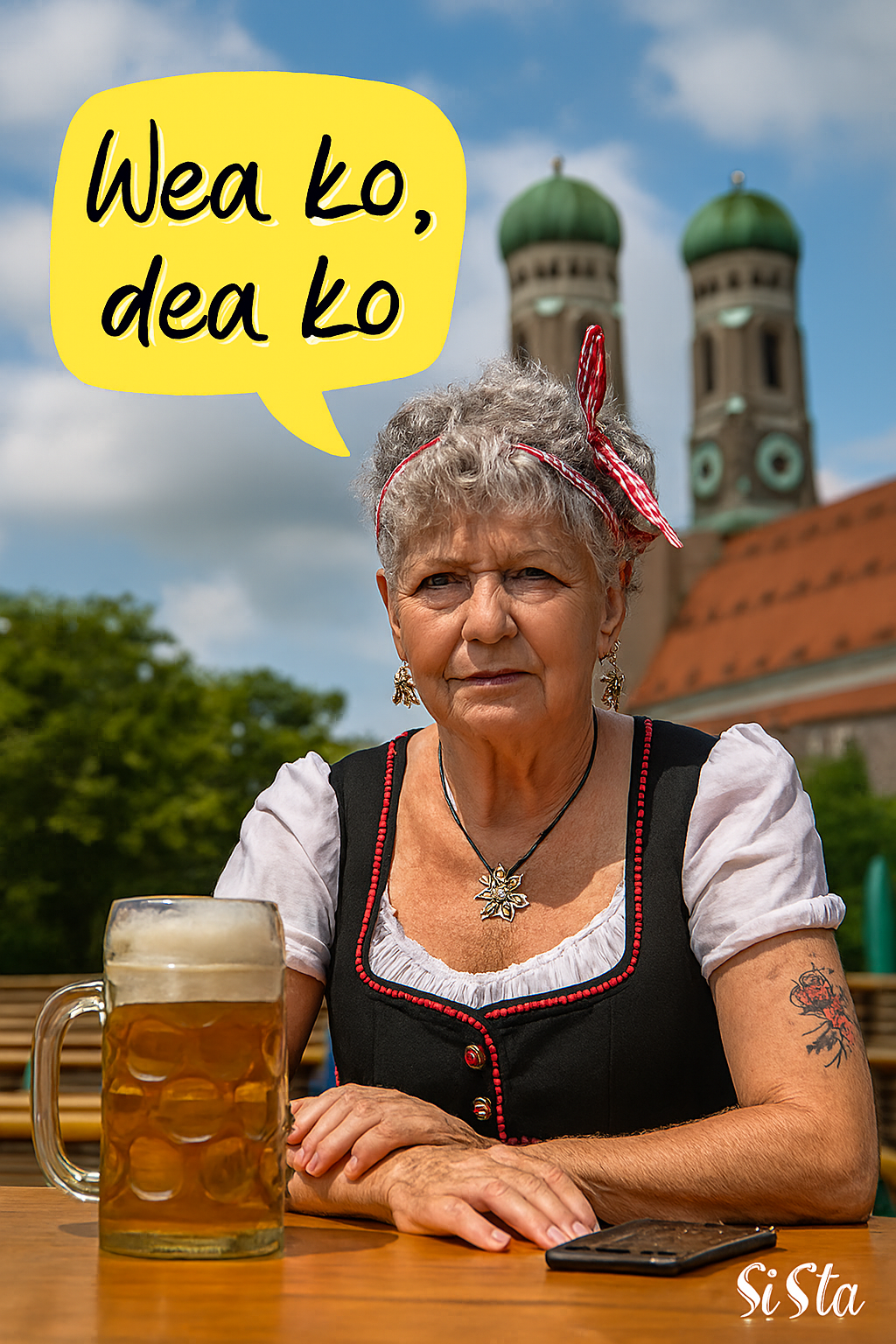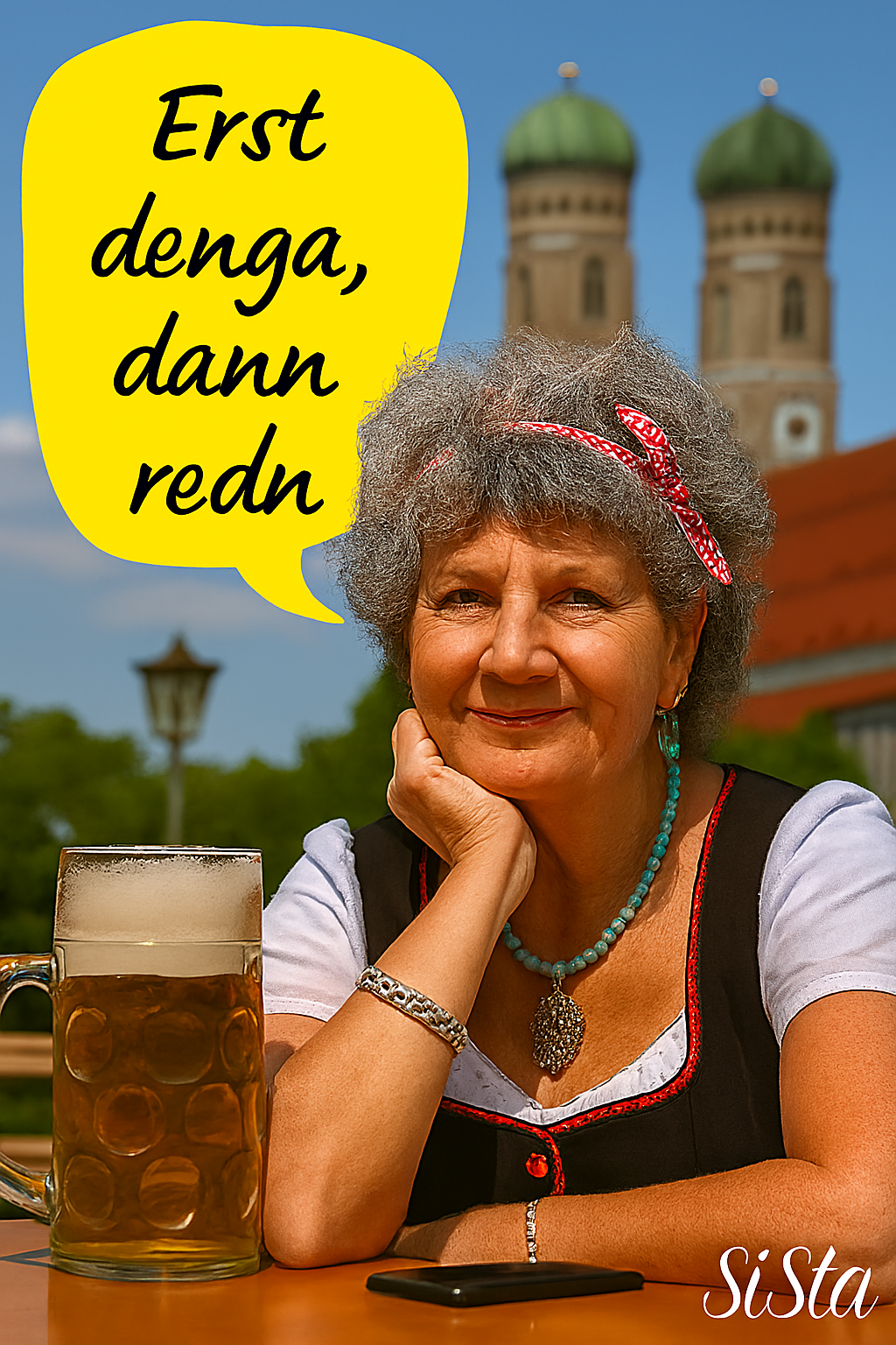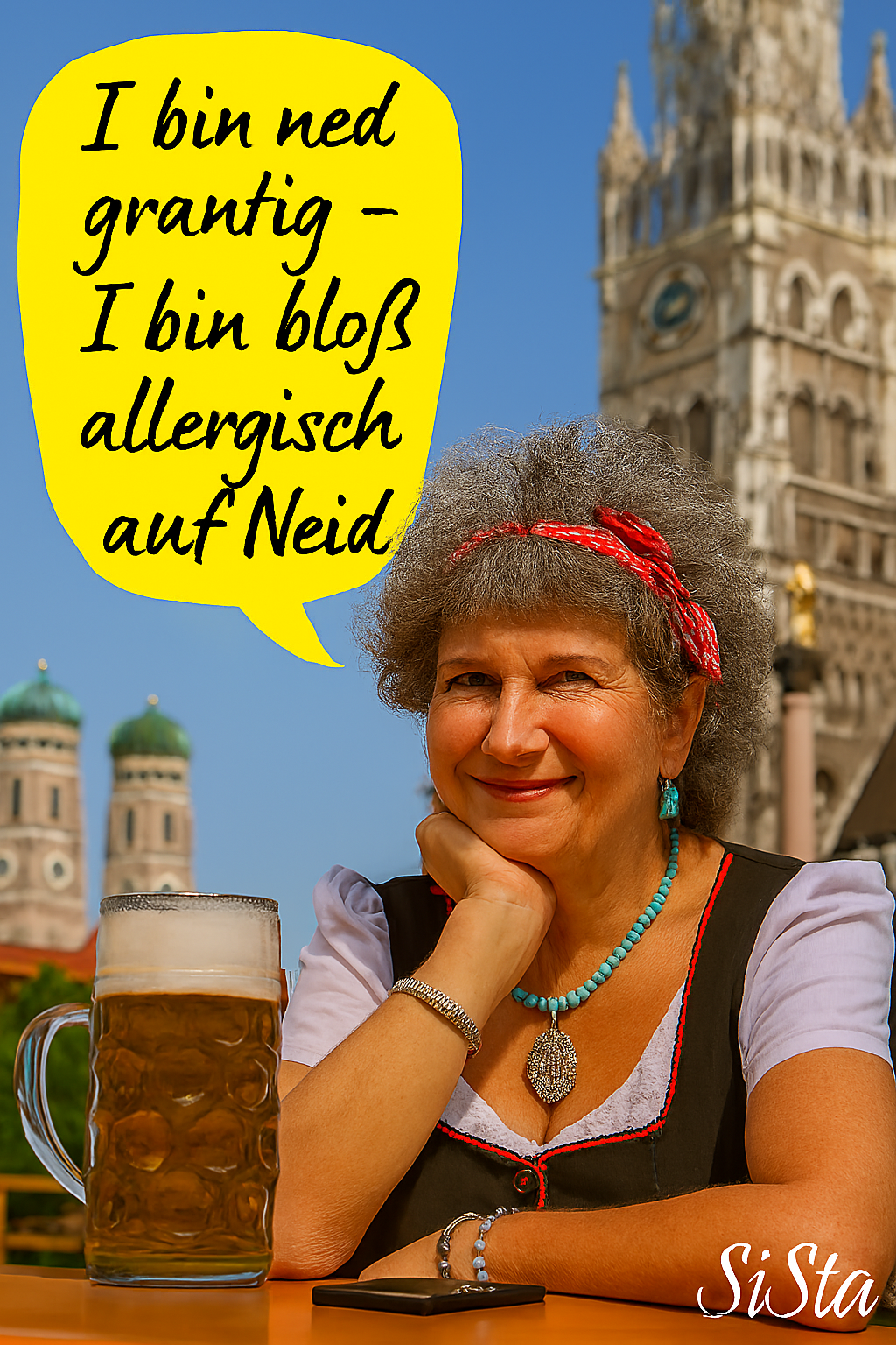 Die Bayerische Grantlerin sagt, was Sache ist – mit einem Maß Bier vor sich, einem Blick, der keine Ausreden duldet, und Sprüchen, die sitzen wie ein Dirndl am Sonntag.