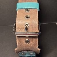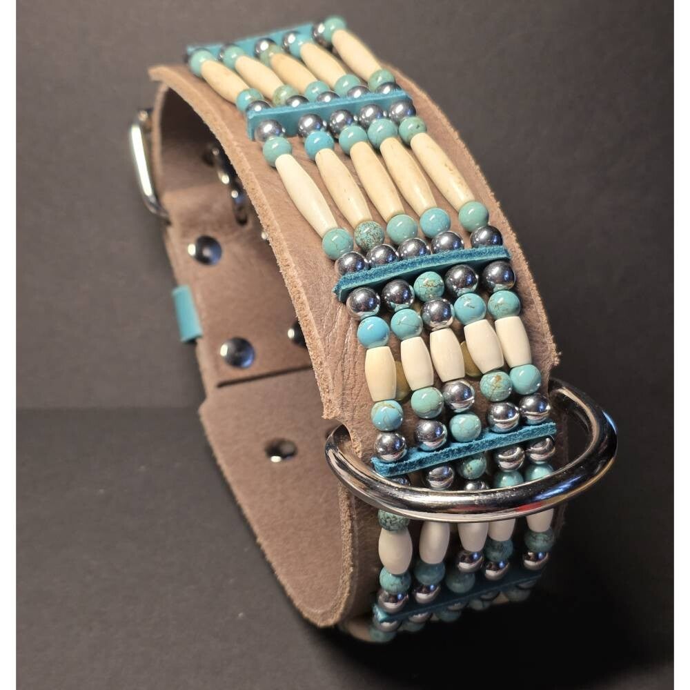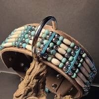 Das 6 cm breite Western-Halsband wird individuell nach deinem Wunschmaß ab 45 cm Halsumfang angefertigt. Der aufwendige 5-reihige Besatz besteht aus Bonepipe, Howlithperlen und silbern glänzenden echten Perlen und unterstreicht den einzigartigen Western-Charme. Türkisfarbene Fettleder-Elemente setzen stilvolle Akzente.